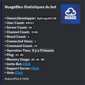 Utilisez la commande <mark style="color:blue;">**/stats**</mark> pour voir les statistique du bot tel que le nombre de personne ayant le bot sur son serveur, le nombre d'utilisateur, le nombre de personne écoutant de la musique, et bien plus...